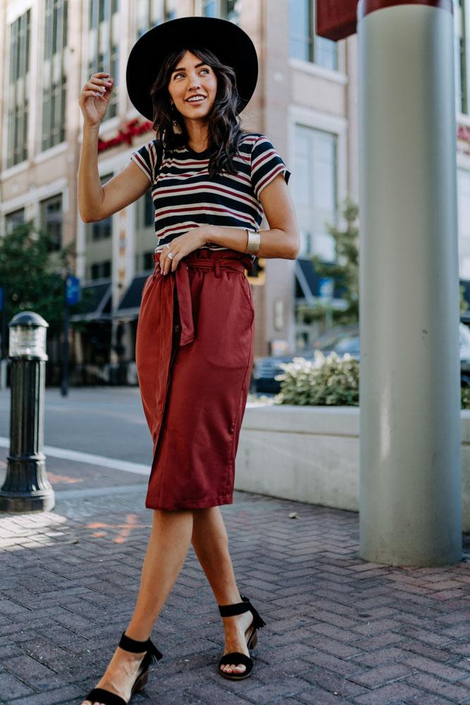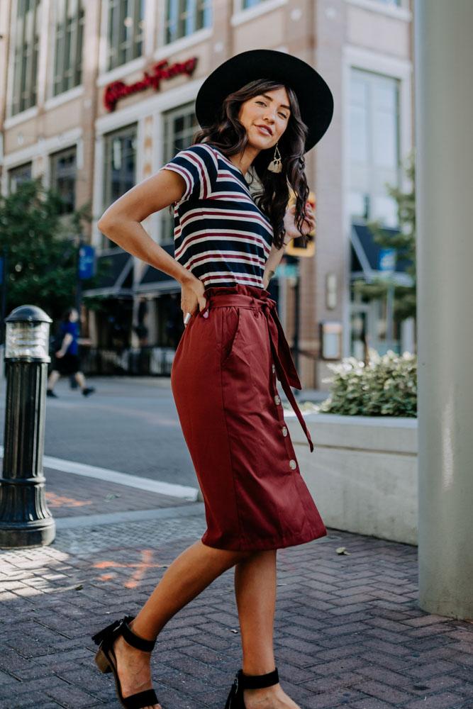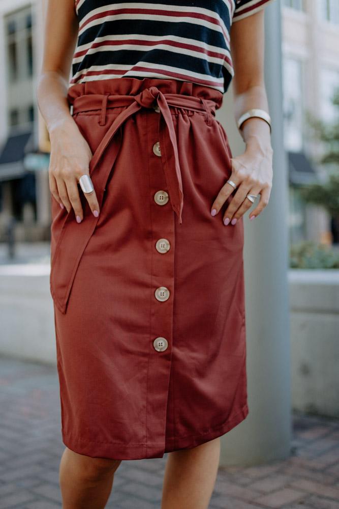 The Arlington Paper Bag Skirt features an elastic cinch waist with a tie, buttons down the front, and the best part - pockets! Pair this skirt with a graphic tee for a casual look or a flowy blouse for something a little more dressed up!