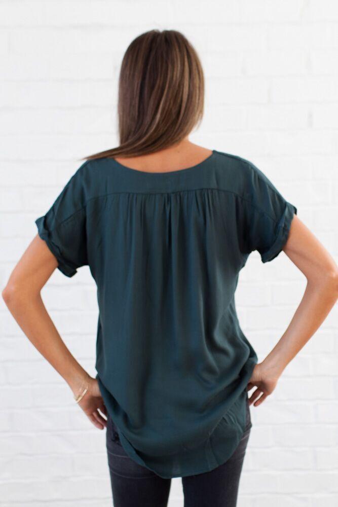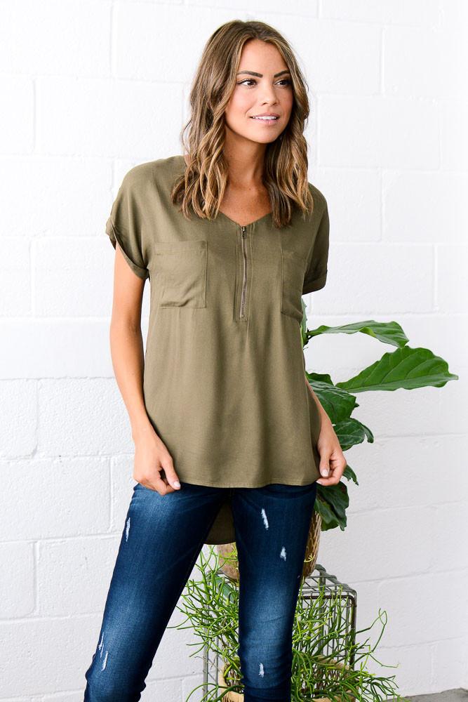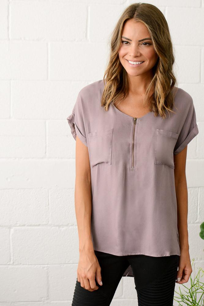 Cruise around town in this top that features double breast pockets, front zipper, cuffed sleeves and high low styling. Tuck it in, wear it under a cardigan, or flaunt it with a pair of skinny jeans. This is the perfect top to hit the town in!