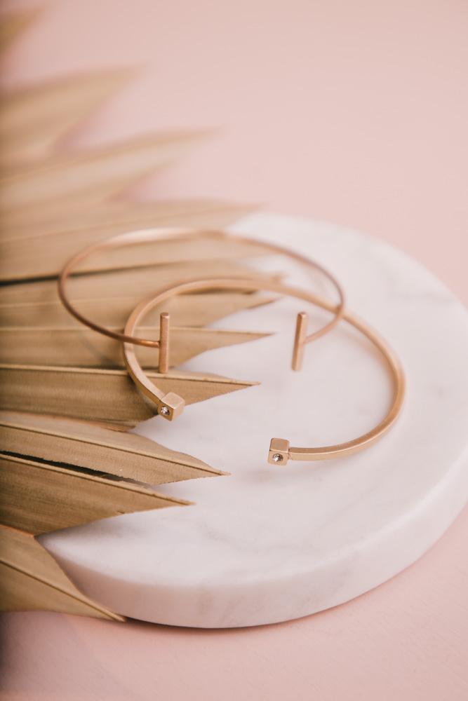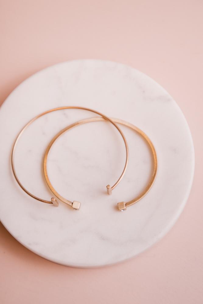 The Double the Trouble Cuff in Gold is a must have for your accessories! This piece features two separate cuffs in one. One of them has two thin bar details, and the other has cubes with a tiny diamond in them.