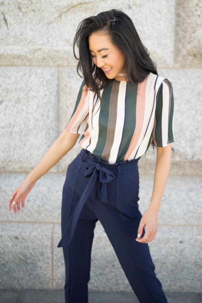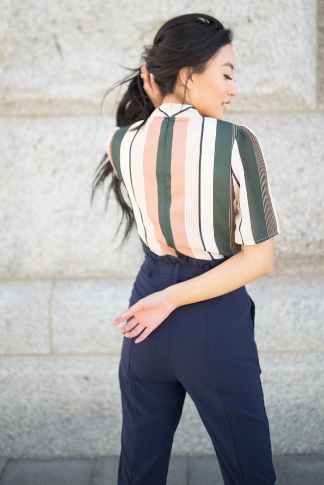 The Amici Stripe Mock Neck Blouse features a mock neckline, three quarter length sleeves with an ivory, green, navy and mauve stripe print. Hidden zipper closure with clasp in the back.