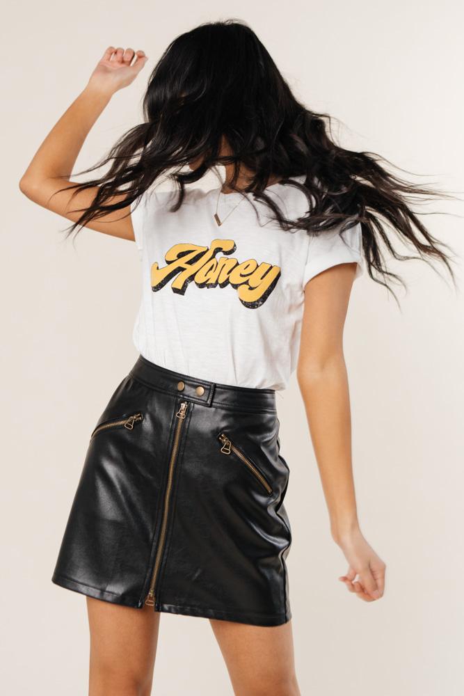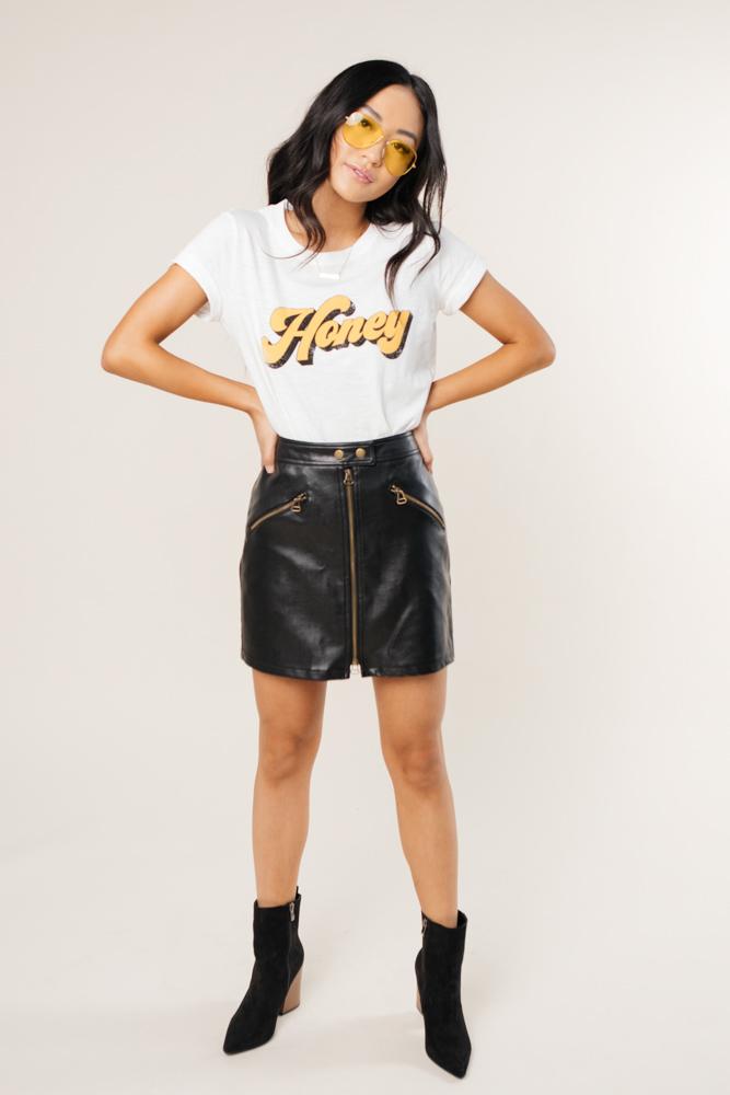 Edge up any outfit with out Harvey Vegan Leather Skirt. This skirt features a full front zip closure, snap button detailing, and front pockets.